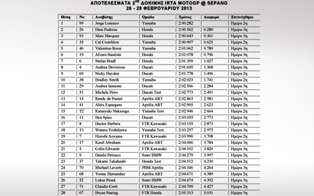 Συνολικά αποτελέσματα 2ης σειράς δοκιμών στην Sepang